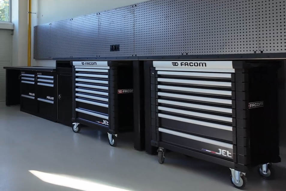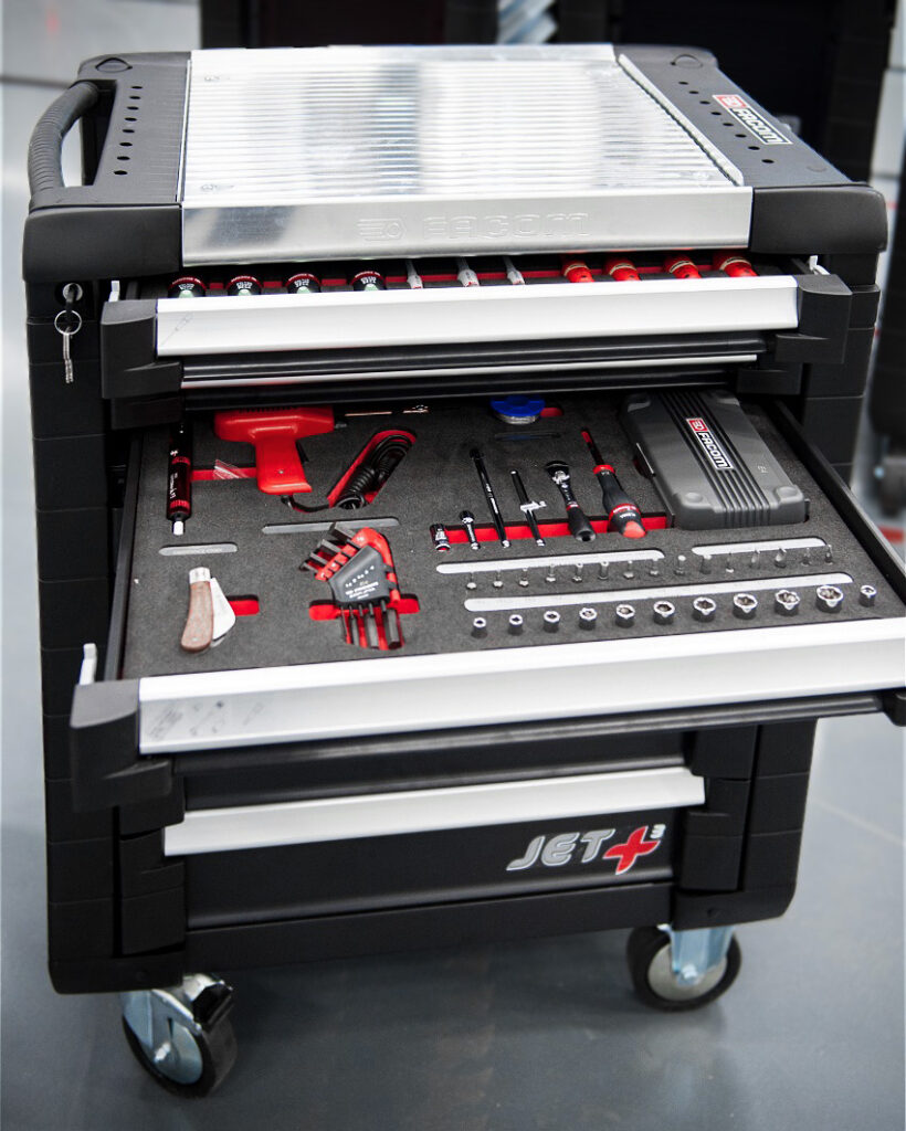 We provide complete workshop setups — workbenches, cabinets, and tool trolleys — including tool-control foam inserts in your chosen color, as well as laser-marked tools with information plates.